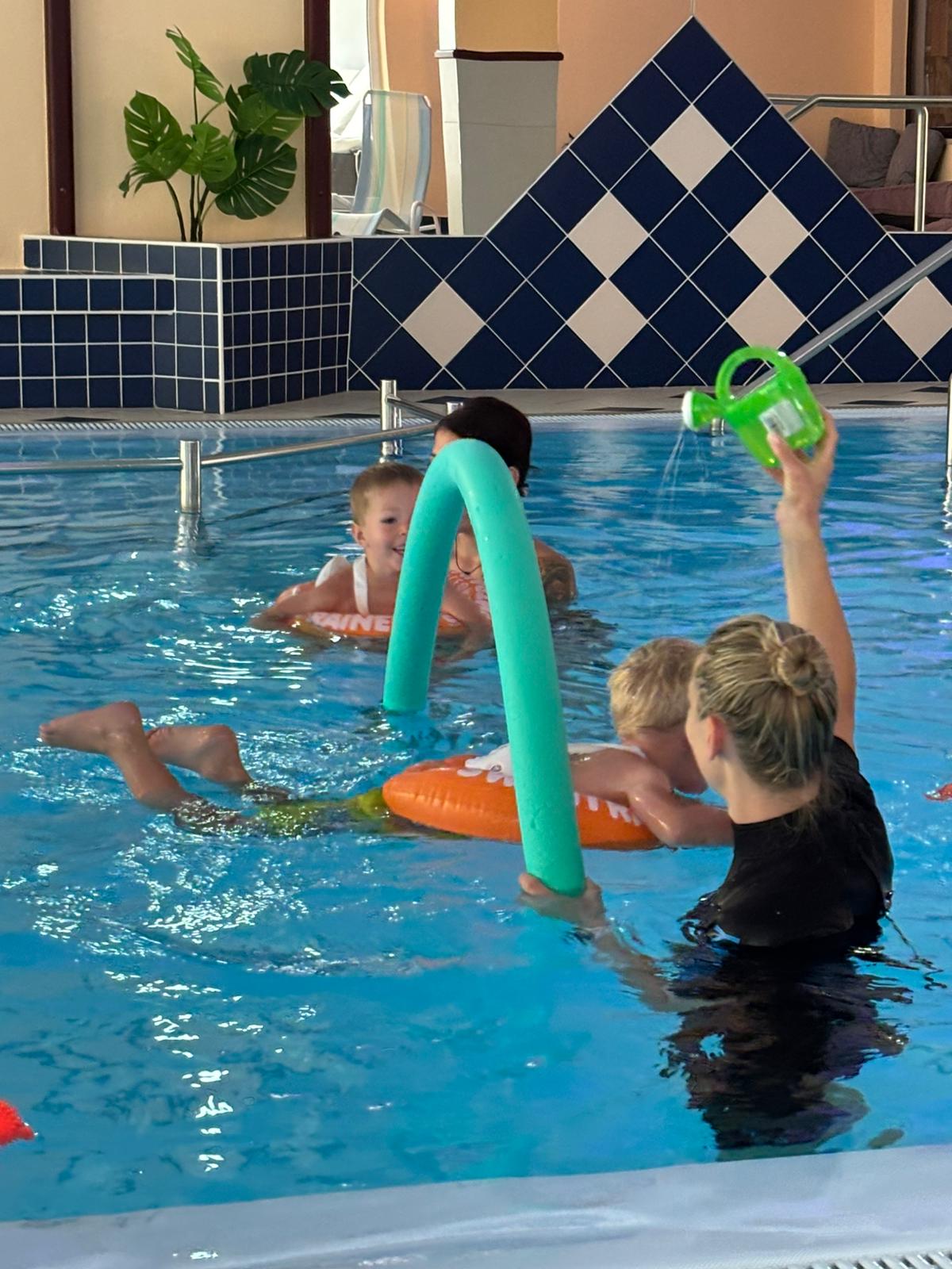 Spielerisch Vertrauen zum Wasser aufbauen: In kleinen Gruppen entdecken Kleinkinder gemeinsam mit vertrauten Bezugspersonen das Element Wasser. Ziel ist es, Ängste abzubauen, Motorik zu fördern und erste positive Wassererfahrungen zu sammeln.